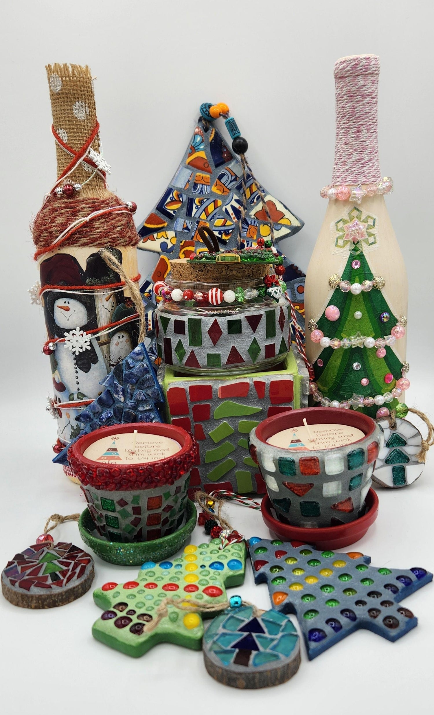 This collection showcases a variety of decorative wine bottles and mosaic planter pots, and small mosaic pots with scented candles.