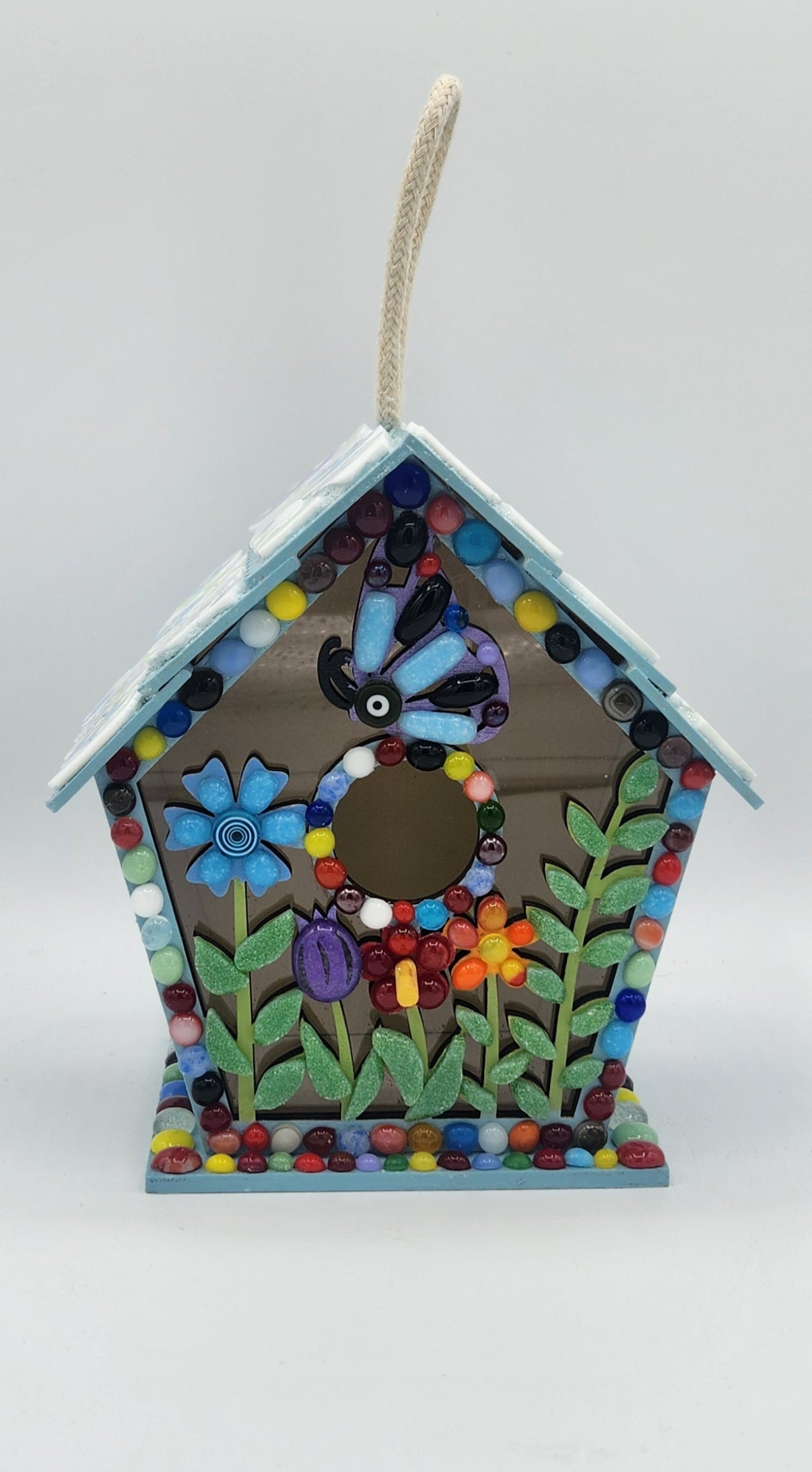 Add a vibrant touch to your indoor space or covered porch with this colorful mosaic birdhouse. Expertly crafted and sealed for durability.  Its decorative design combines fun and beauty, making it an eye-catching hanging accent for, patios, or balconies. Enjoy both style and function with this unique birdhouse that invites nature closer to your home.
