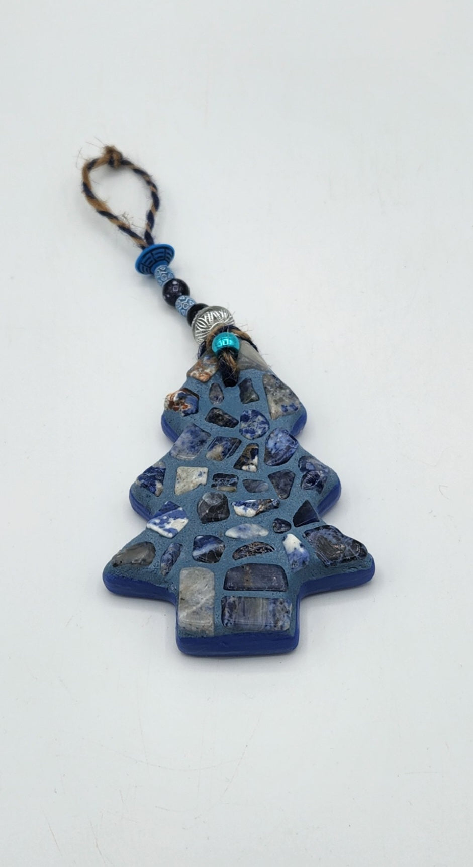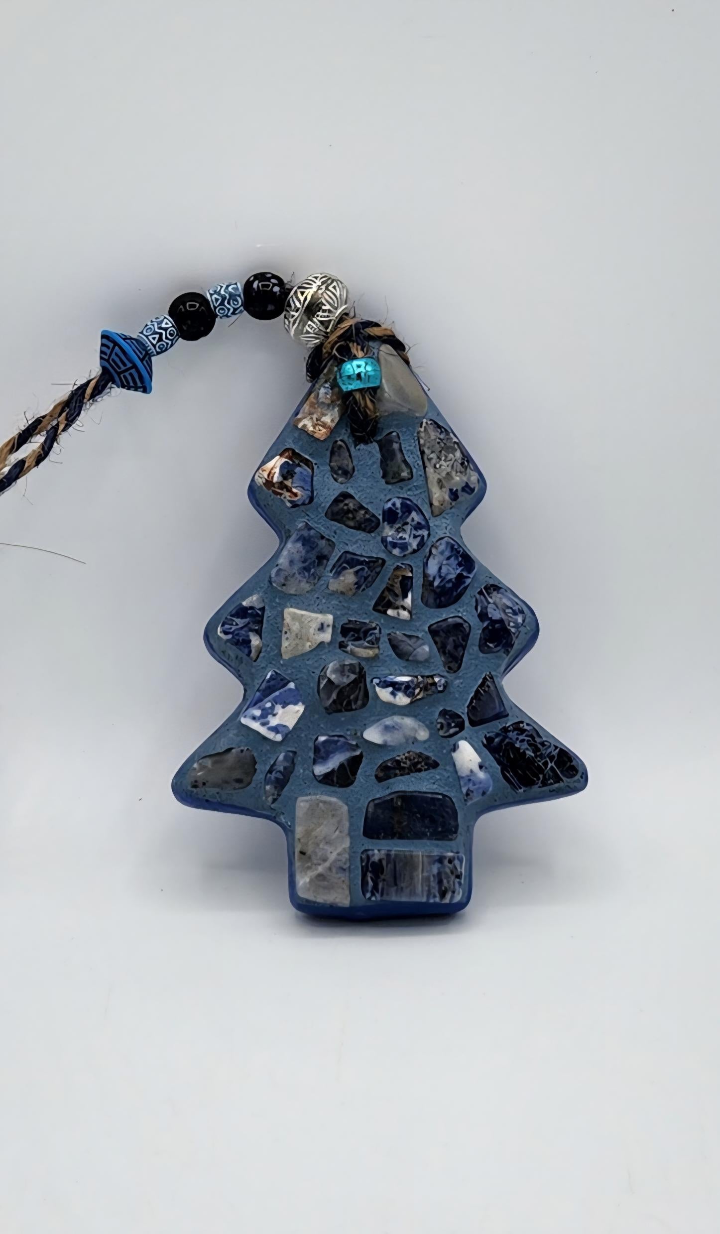 This charming mosaic ornament adds a festive touch to your tree with its striking design. Made from gorgeous blue stone gems set against a deep, rich blue background, it measures 5x3 inches—the perfect size to stand out among your holiday decor. A decorative beaded string makes it easy to hang, ensuring your tree is anything but ordinary. It’s a playful spin on traditional ornaments that’s sure to have guests asking where you found such a gem!