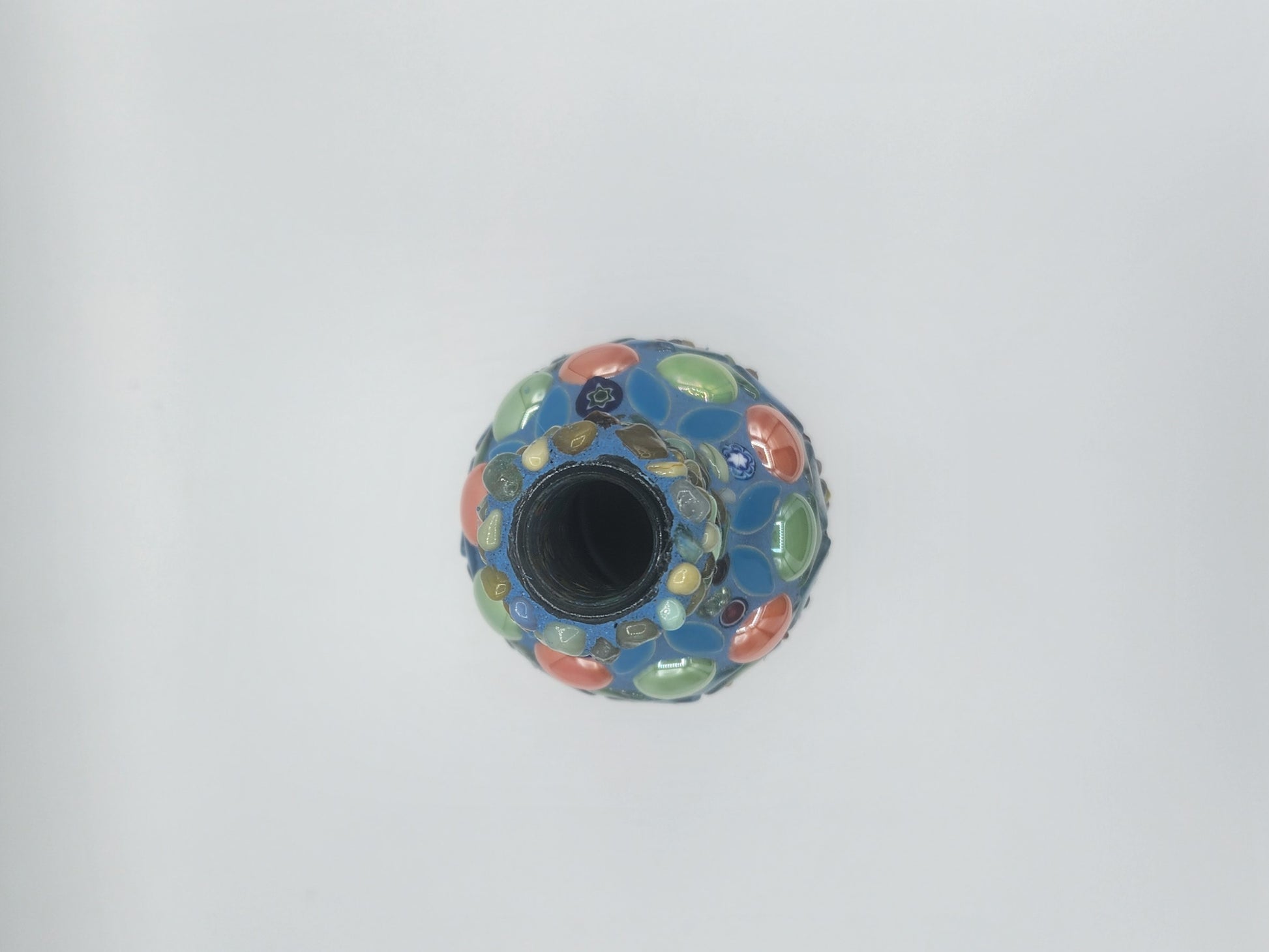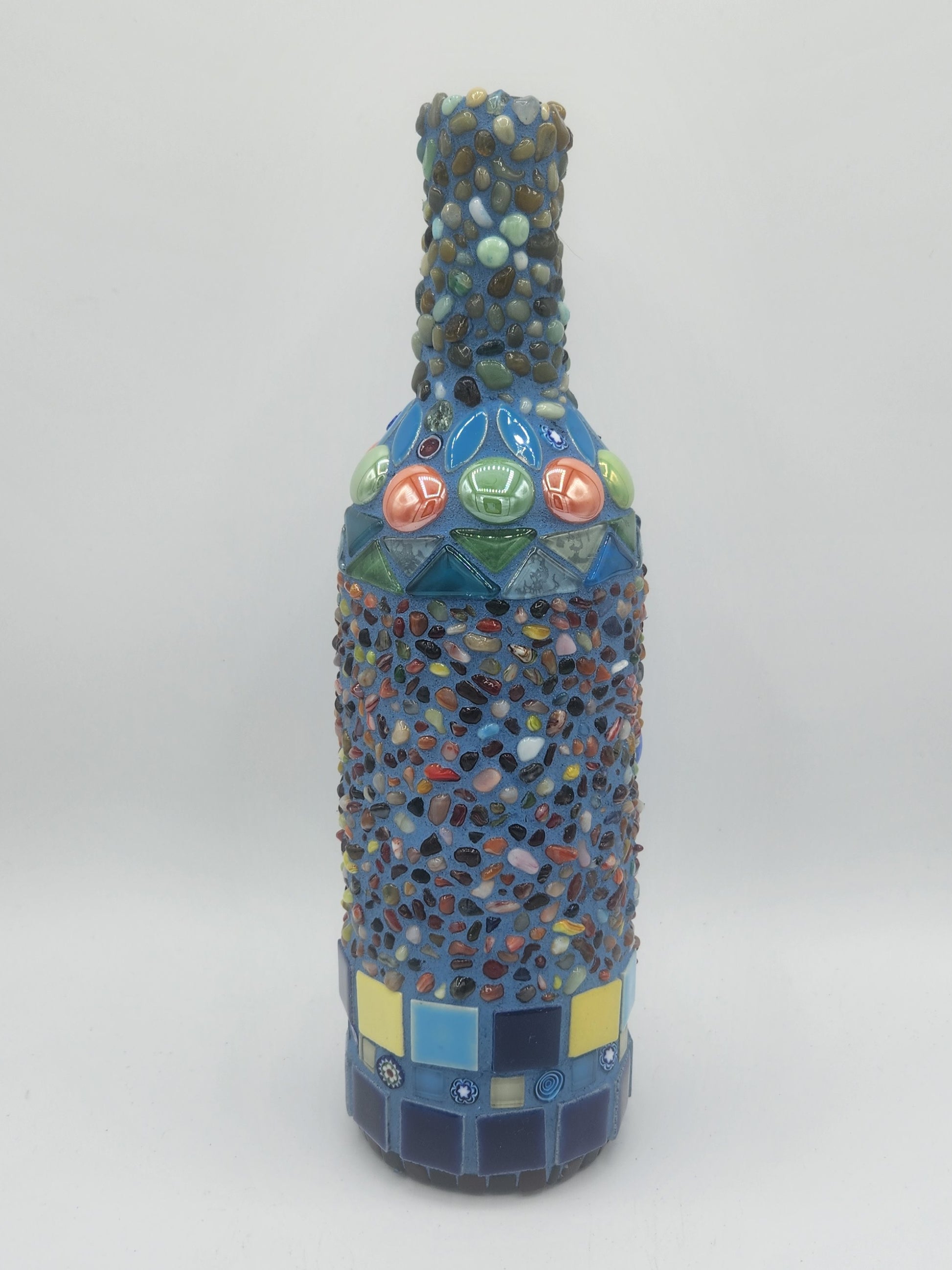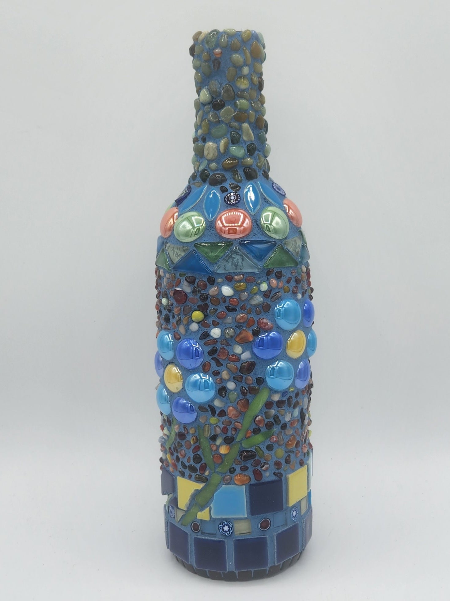 This exquisite blue mosaic wine bottle is crafted from a blend of materials. Set against a light blue grout, it provides an ideal backdrop for the vibrant colors. The materials include small stone pebbles, glass and ceramic pieces, and tiny millefiori pieces, with two flowers adorning the front of the bottle.