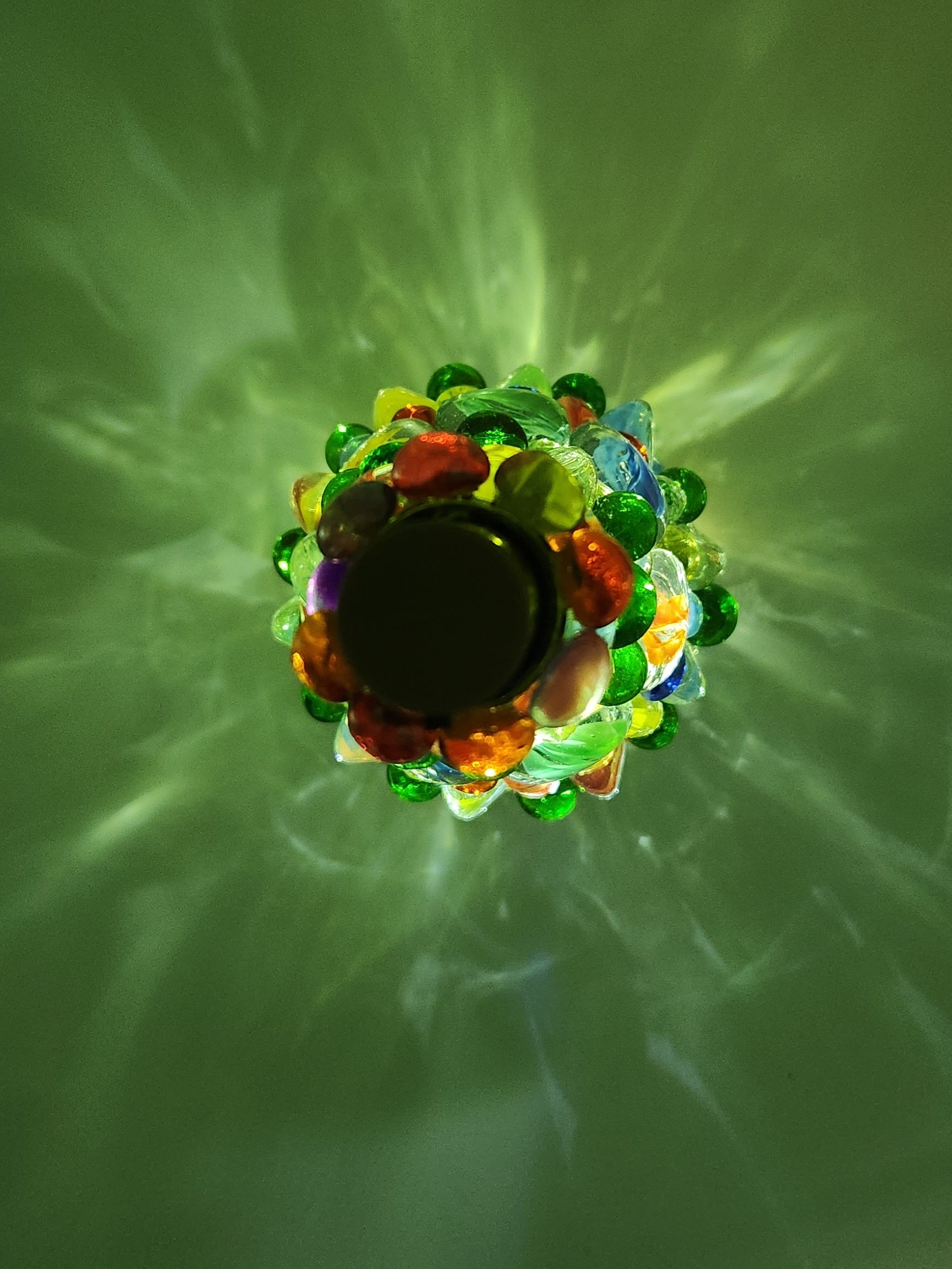 The light casts a beautiful glow through the colorful mosaic wine bottle, adding a touch of sparkle to any room. Crafted from glass pieces of various sizes and shapes, it features no grout to allow the light to pass through unobstructed. The bottle comes complete with a cork and attached fairy lights.