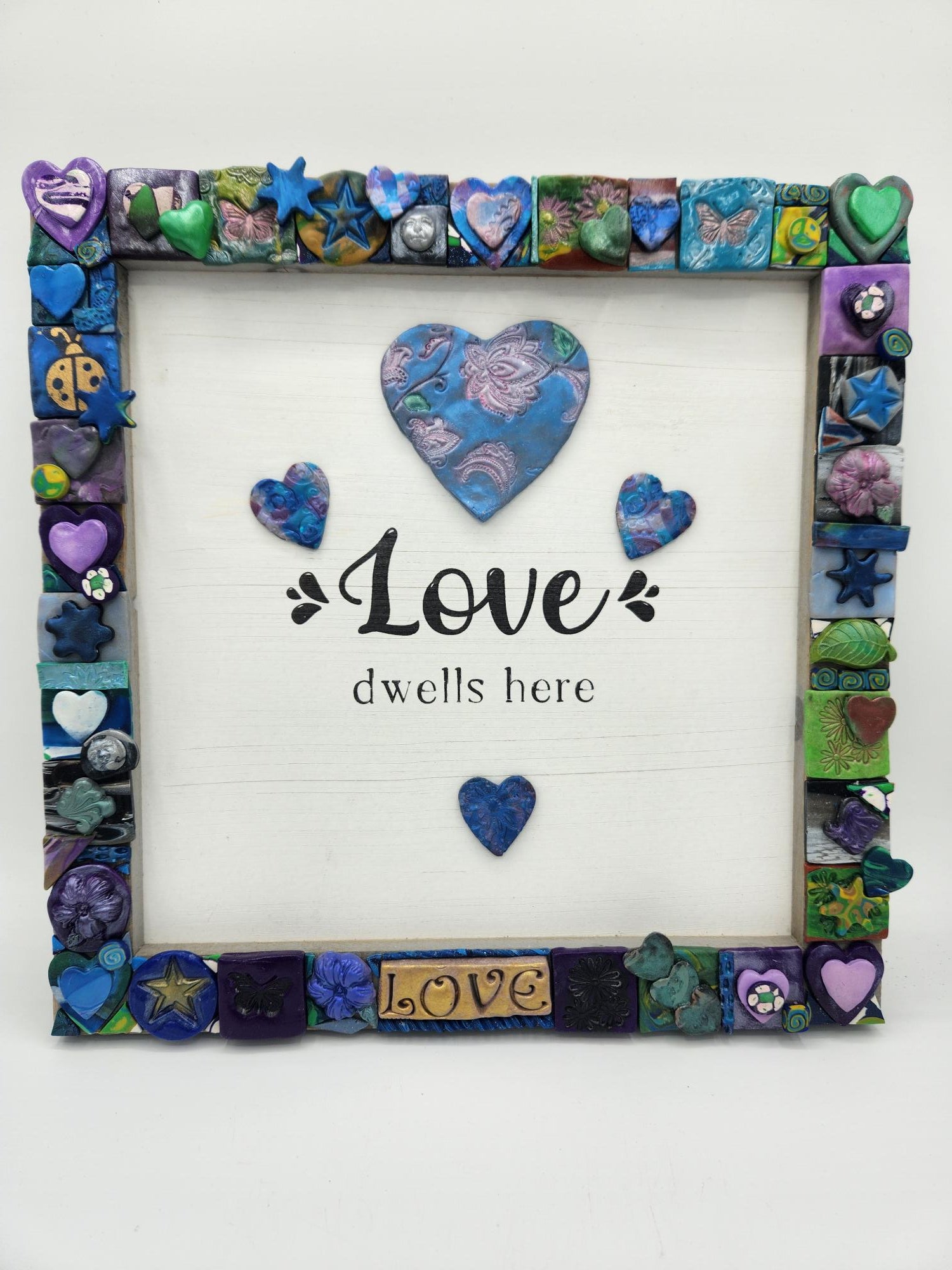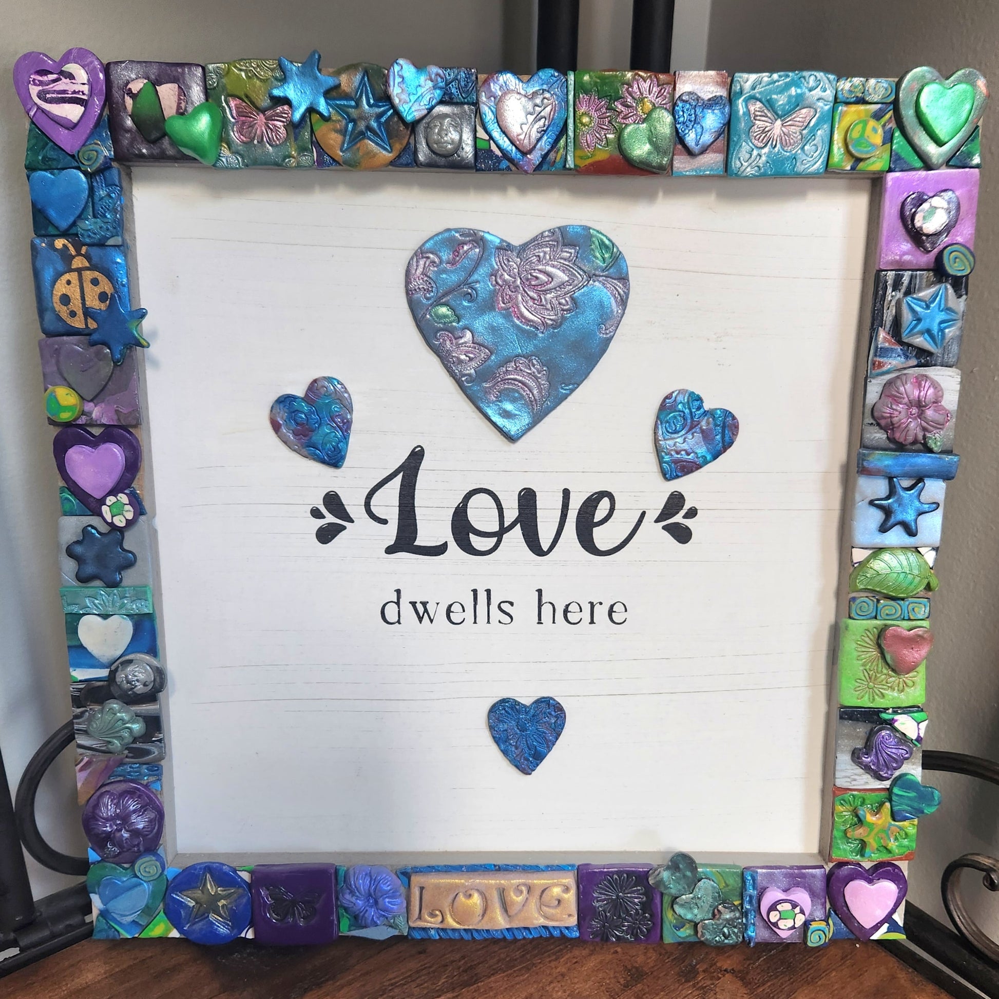 Love resides here, encircled by a variety of handmade polymer clay tiles. They are artfully assembled with a harmonious blend of colors and shapes, designed to bring a touch of love into your home. The dimensions are 11.75 by 11.75 inches.